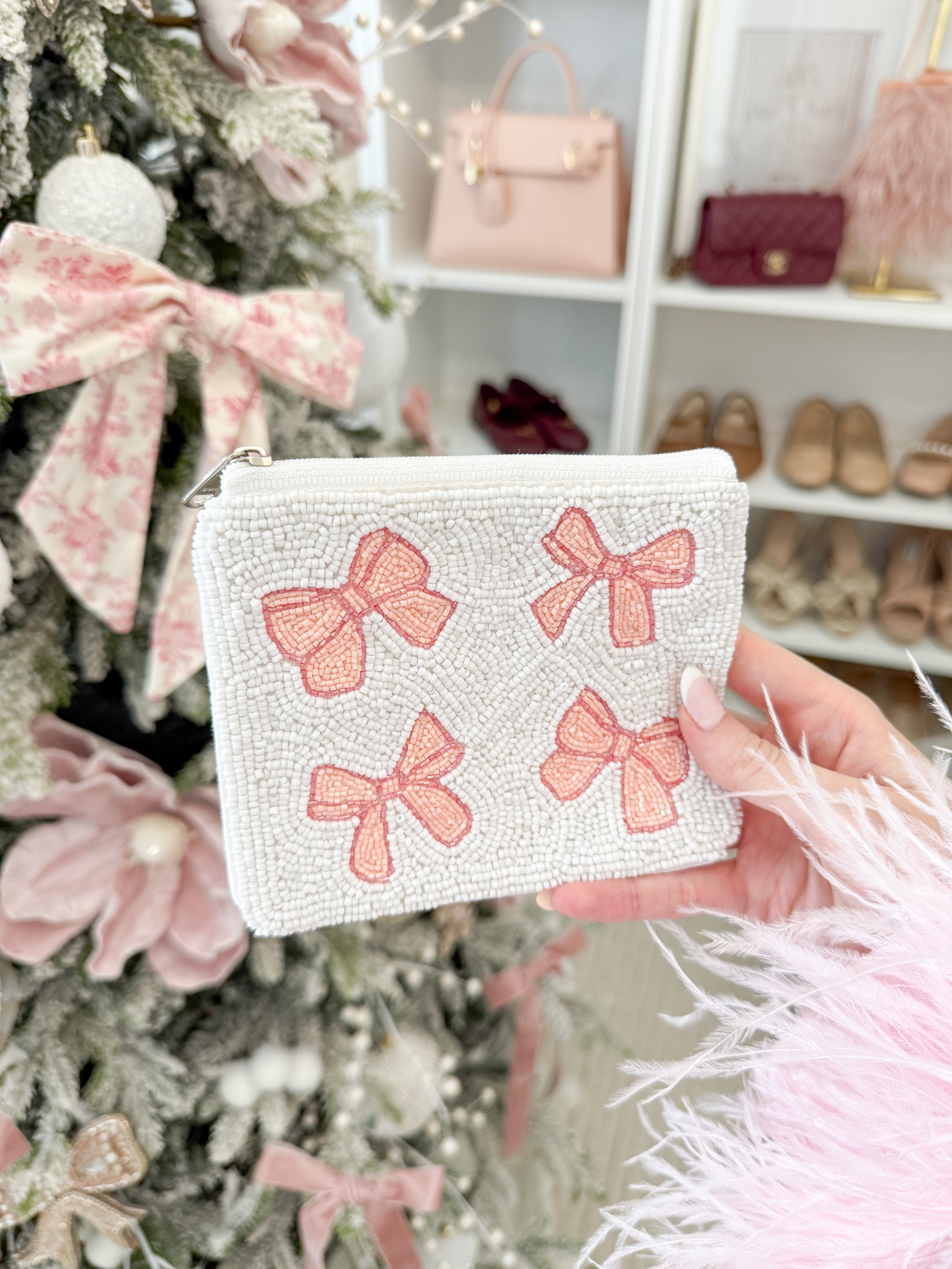 Add a touch of feminine charm to your accessories with this beaded pink bows zipper pouch. Featuring four delicate hand-beaded pink bows on a soft ivory background, this pouch is perfect for carrying small essentials like cards, coins, keys, or makeup. The compact size and secure zipper closure make it a stylish and practical choice for daily use or gifting.
