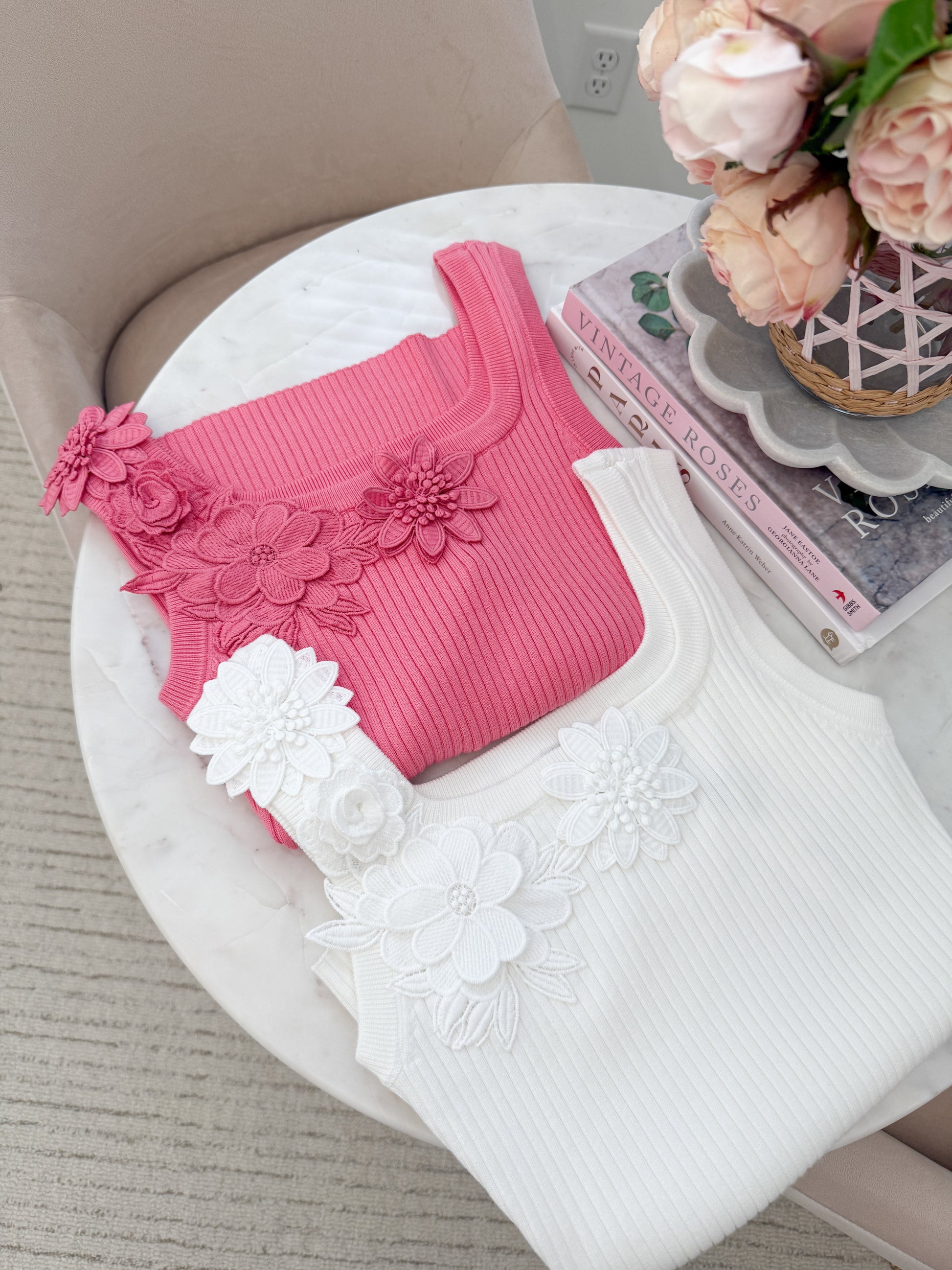 -3D Floral Appliqué trim tank top -Ribbed knit sweater -Square neckline -Sleeveless with shoulder straps -Fitted silhouette
