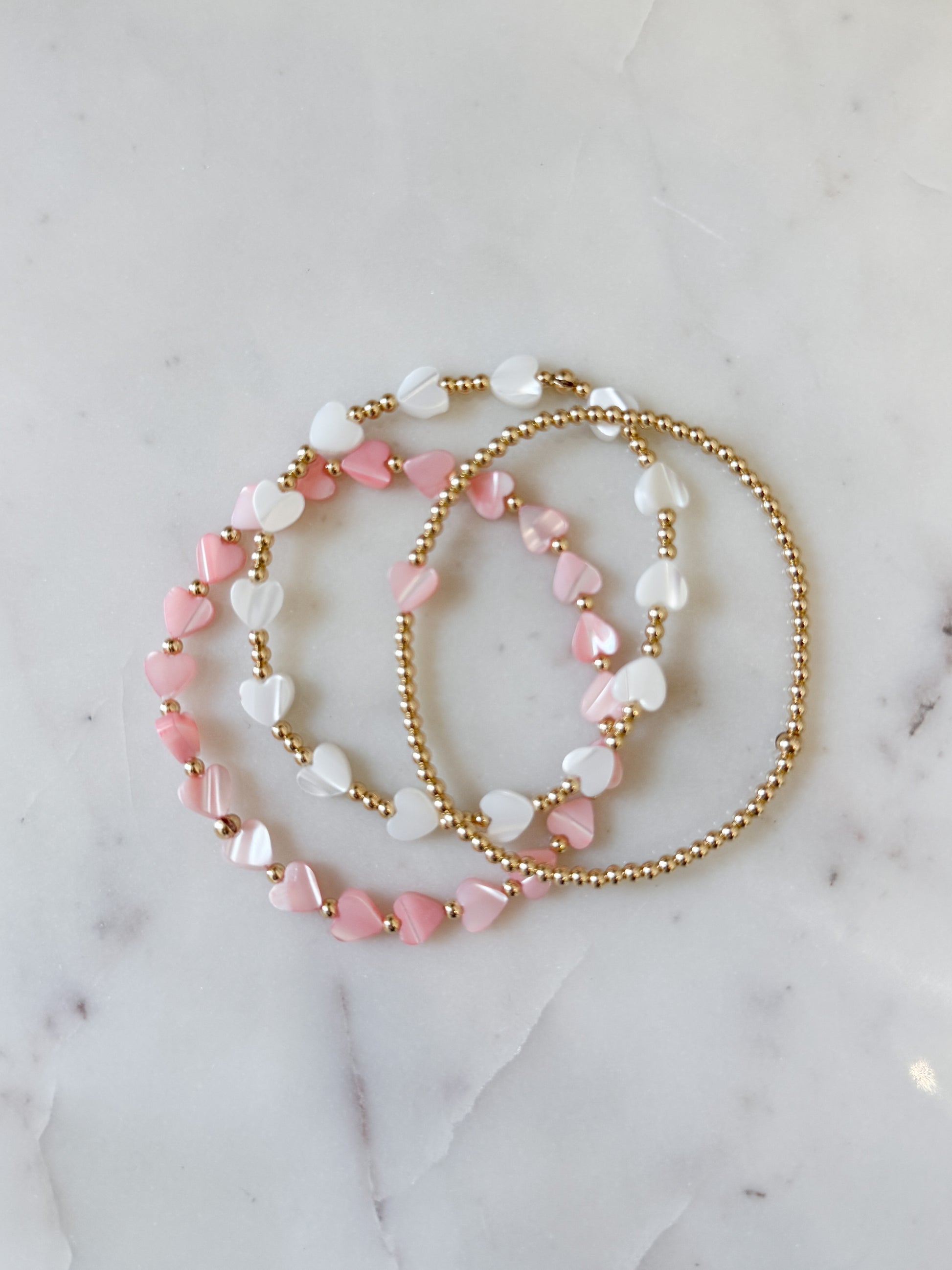 Elevate your everyday elegance with the Sweetheart Bracelet, a refined piece combining mother of pearl hearts with 14k gold filled beads on a comfortable stretch band.
